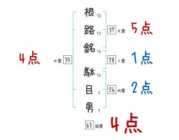天運![]() | 根路銘駄目男さんの天運は37画の5つ星!努力家で順応性に優れる。現実的な考え方ができ忠実に物事をこなす。 家系が持つ宿命的な運勢を表します。祖先から受け継いだ苗字ですので自分の力が及びません。家柄を象徴します。 |