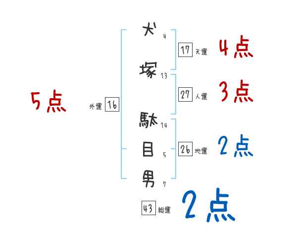 天運![]() | 犬塚駄目男さんの天運は17画の4つ星!積極的な行動力。地位を気づき財産を手に入れる。純粋な心と直感力。 家系が持つ宿命的な運勢を表します。祖先から受け継いだ苗字ですので自分の力が及びません。家柄を象徴します。 |