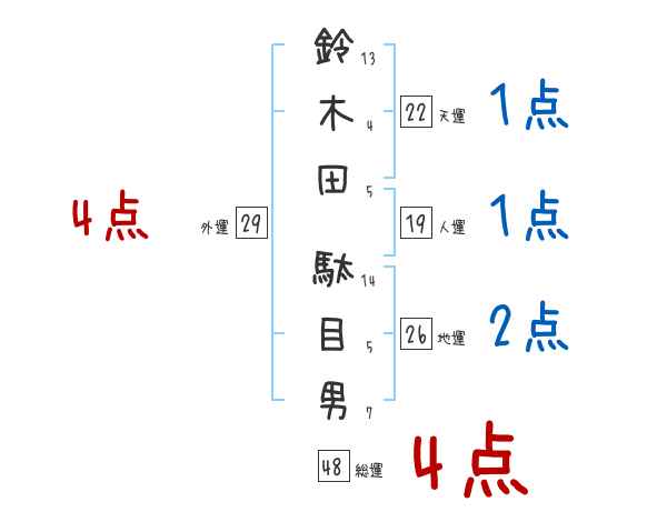 人運![]() | 鈴木田駄目男さんの人運は19画の1つ星!優れた才能を持ちますが、協調性が足りないことも。周りの人と協力する事を意識しましょう。 性格や才能などを表す2番目に重要な運勢です。人間関係や協調性、社会的な成功に影響します。主に20歳から50歳ぐらいまでの中年期の運勢を表します。 |