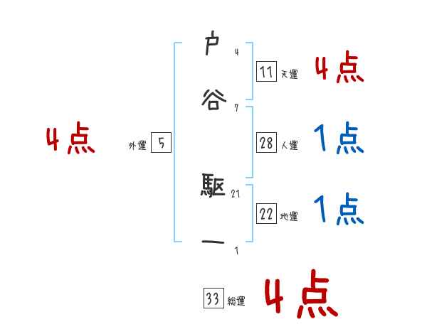 天運![]() | 戸谷駆一さんの天運は11画の4つ星!着実に富や地位を得る幸運な人生。 家系が持つ宿命的な運勢を表します。祖先から受け継いだ苗字ですので自分の力が及びません。家柄を象徴します。 |