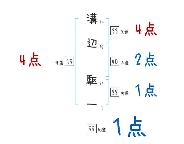 天運![]() | 溝辺駆一さんの天運は33画の4つ星!権力志向でプライドが高い。勇気があり運を切り開き成功する。 家系が持つ宿命的な運勢を表します。祖先から受け継いだ苗字ですので自分の力が及びません。家柄を象徴します。 |