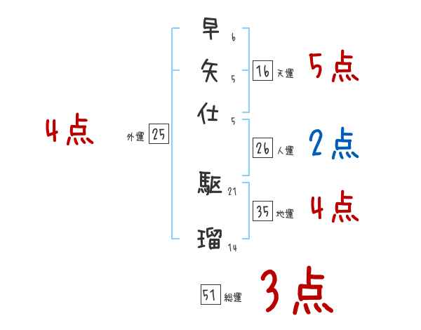 天運![]() | 早矢仕駆瑠さんの天運は16画の5つ星!人望が厚く大きく発展する。逆転成功が見える。 家系が持つ宿命的な運勢を表します。祖先から受け継いだ苗字ですので自分の力が及びません。家柄を象徴します。 |