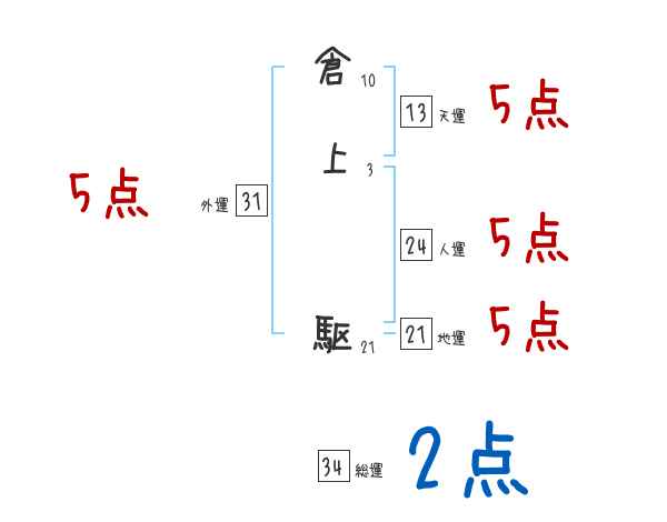 天運![]() | 倉上駆さんの天運は13画の5つ星!才能に恵まれ人気がある。名声を手に入れる。円満な人生。 家系が持つ宿命的な運勢を表します。祖先から受け継いだ苗字ですので自分の力が及びません。家柄を象徴します。 |