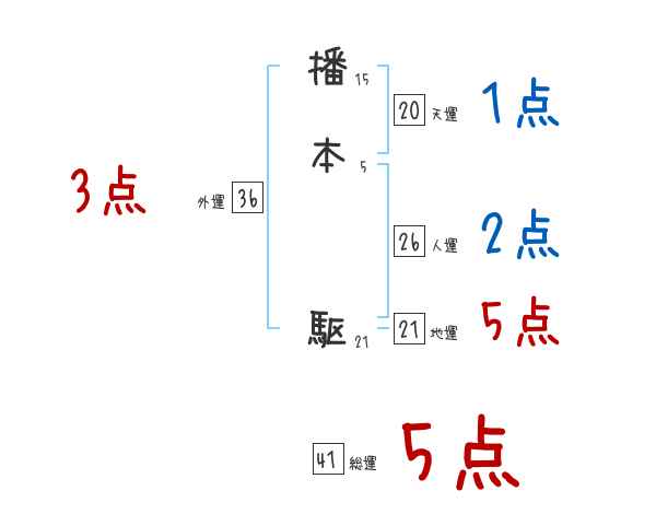 外運![]() | 播本駆さんの外運は36画の3つ星!先見性が豊かです。多少神経質で苦労することも。 生活面を象徴する運勢です。外部から受ける影響力を表し、結婚運、家庭運や職場、環境への順応性を表します。 |