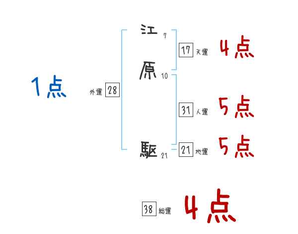 天運![]() | 江原駆さんの天運は17画の4つ星!積極的な行動力。地位を気づき財産を手に入れる。純粋な心と直感力。 家系が持つ宿命的な運勢を表します。祖先から受け継いだ苗字ですので自分の力が及びません。家柄を象徴します。 |