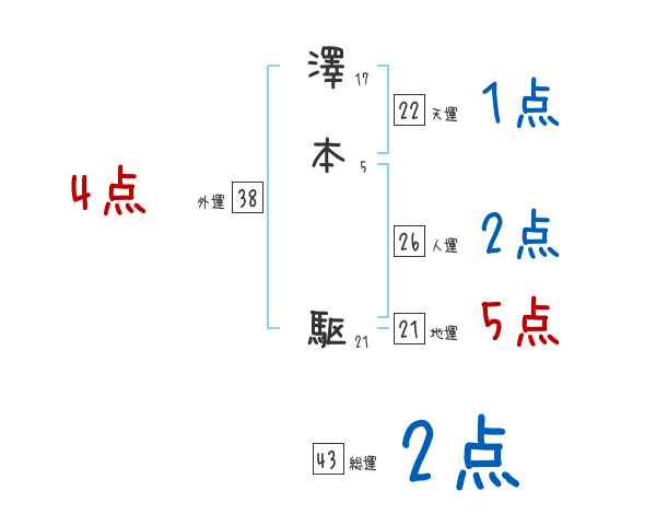 天運![]() | 澤本駆さんの天運は22画の1つ星!努力することが苦手ないっぽう手先が器用。芸術性にも優れる。 家系が持つ宿命的な運勢を表します。祖先から受け継いだ苗字ですので自分の力が及びません。家柄を象徴します。 |
