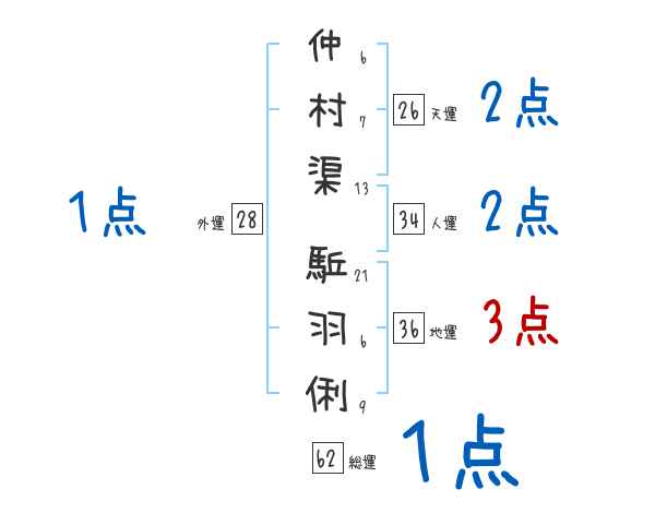 天運![]() | 仲村渠駈羽俐さんの天運は26画の2つ星!波瀾万丈かも。信頼できる人を大事にしましょう。 家系が持つ宿命的な運勢を表します。祖先から受け継いだ苗字ですので自分の力が及びません。家柄を象徴します。 |