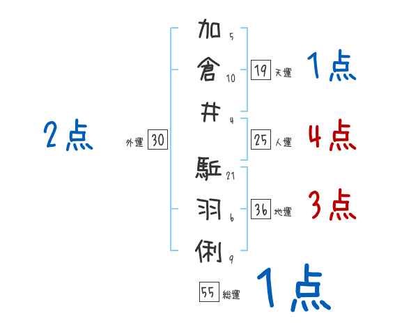 地運![]() | 加倉井駈羽俐さんの地運は36画の3つ星!先見性が豊かです。多少神経質で苦労することも。 個性を表す基礎的な運勢です。性格形成や対人関係、行動力など家庭環境に影響されます。主に誕生してから20歳くらいまでの若年期の運勢を表します。 |
