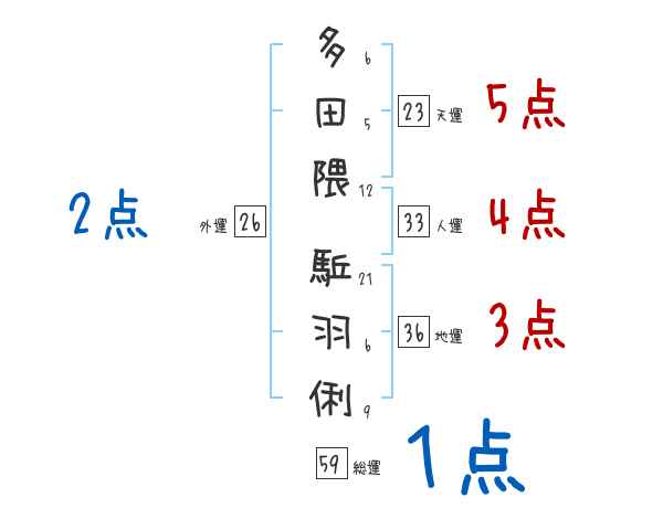 天運![]() | 多田隈駈羽俐さんの天運は23画の5つ星!想像力に優れ活力がある。一代で成功し名誉を手に入れる。 家系が持つ宿命的な運勢を表します。祖先から受け継いだ苗字ですので自分の力が及びません。家柄を象徴します。 |