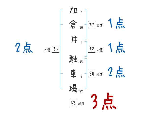 人運![]() | 加倉井駐車場さんの人運は19画の1つ星!優れた才能を持ちますが、協調性が足りないことも。周りの人と協力する事を意識しましょう。 性格や才能などを表す2番目に重要な運勢です。人間関係や協調性、社会的な成功に影響します。主に20歳から50歳ぐらいまでの中年期の運勢を表します。 |