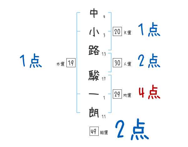 外運![]() | 中小路駿一朗さんの外運は19画の1つ星!優れた才能を持ちますが、協調性が足りないことも。周りの人と協力する事を意識しましょう。 生活面を象徴する運勢です。外部から受ける影響力を表し、結婚運、家庭運や職場、環境への順応性を表します。 |