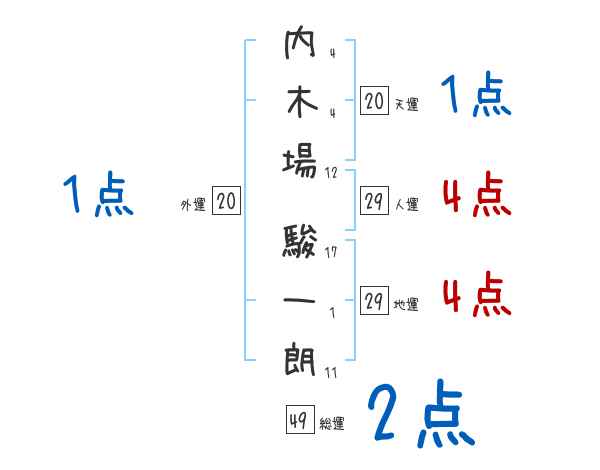 総運![]() | 内木場駿一朗さんの総運は49画の2つ星!不安定な性格で明暗がある人生。周りの人には支援されやすい。 あなたの人生を表す1番重要な運勢です。生涯を通じて影響する総合運となり、主に50歳以降の晩年期に影響を及ぼします。 |