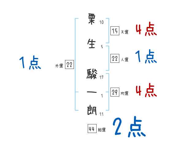 総運![]() | 栗生駿一朗さんの総運は44画の2つ星!誠実で慎重な性格。物事を考えすぎないように注意しましょう。 あなたの人生を表す1番重要な運勢です。生涯を通じて影響する総合運となり、主に50歳以降の晩年期に影響を及ぼします。 |