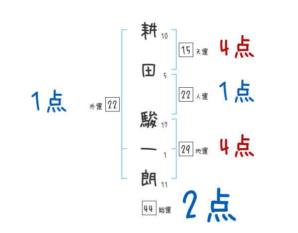 外運![]() | 耕田駿一朗さんの外運は22画の1つ星!努力することが苦手ないっぽう手先が器用。芸術性にも優れる。 生活面を象徴する運勢です。外部から受ける影響力を表し、結婚運、家庭運や職場、環境への順応性を表します。 |