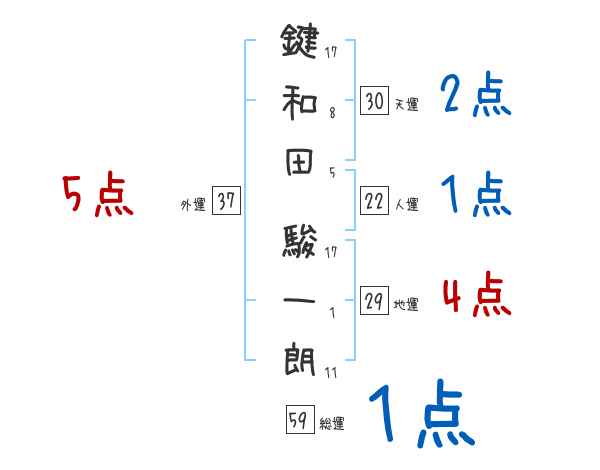 総運![]() | 鍵和田駿一朗さんの総運は59画の1つ星!意志の弱さであきらめることが多いかも。粘り強さが必要。 あなたの人生を表す1番重要な運勢です。生涯を通じて影響する総合運となり、主に50歳以降の晩年期に影響を及ぼします。 |