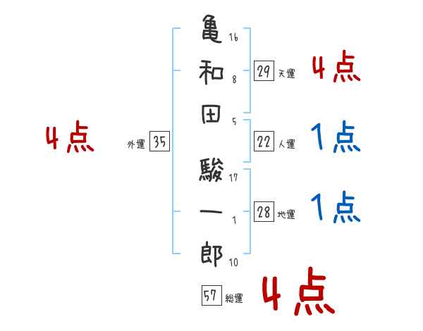 外運![]() | 亀和田駿一郎さんの外運は35画の4つ星!温厚な性格で感受性が高い。穏和な性格で人望が厚い。 生活面を象徴する運勢です。外部から受ける影響力を表し、結婚運、家庭運や職場、環境への順応性を表します。 |