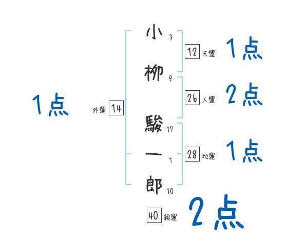 地運![]() | 小栁駿一郎さんの地運は28画の1つ星!家庭環境に注意。スポーツで活躍できる能力があるかも。 個性を表す基礎的な運勢です。性格形成や対人関係、行動力など家庭環境に影響されます。主に誕生してから20歳くらいまでの若年期の運勢を表します。 |