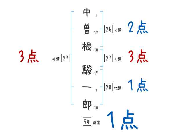 外運![]() | 中曽根駿一郎さんの外運は27画の3つ星!頭脳明晰だが強情で摩擦が多い傾向。孤立に注意。 生活面を象徴する運勢です。外部から受ける影響力を表し、結婚運、家庭運や職場、環境への順応性を表します。 |