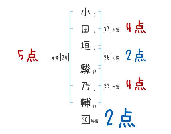 天運![]() | 小田垣駿乃輔さんの天運は17画の4つ星!積極的な行動力。地位を気づき財産を手に入れる。純粋な心と直感力。 家系が持つ宿命的な運勢を表します。祖先から受け継いだ苗字ですので自分の力が及びません。家柄を象徴します。 |
