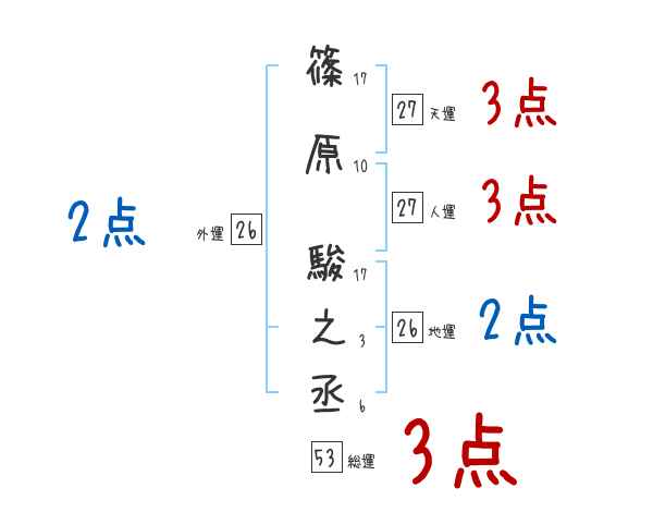 天運![]() | 篠原駿之丞さんの天運は27画の3つ星!頭脳明晰だが強情で摩擦が多い傾向。孤立に注意。 家系が持つ宿命的な運勢を表します。祖先から受け継いだ苗字ですので自分の力が及びません。家柄を象徴します。 |
