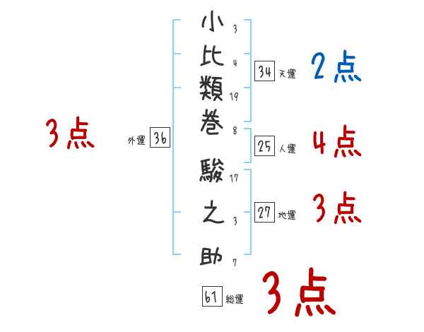 外運![]() | 小比類巻駿之助さんの外運は36画の3つ星!先見性が豊かです。多少神経質で苦労することも。 生活面を象徴する運勢です。外部から受ける影響力を表し、結婚運、家庭運や職場、環境への順応性を表します。 |