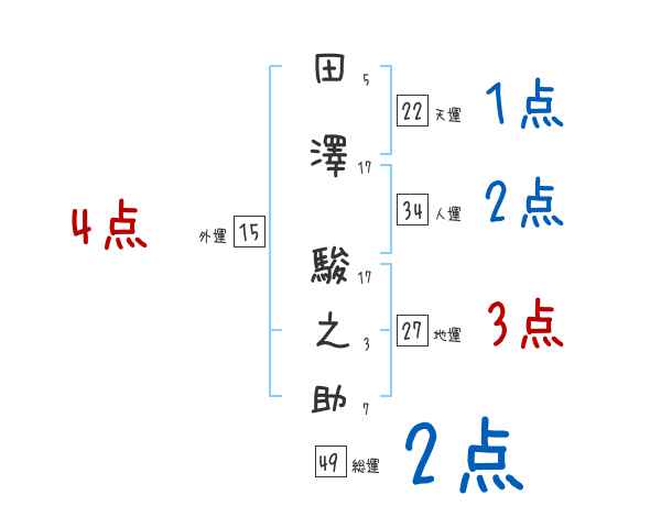 | 外運  | 田澤駿之助さんの外運は15画の4つ星!人徳があり出世する。順調に物事を進め円満な人生。生活面を象徴する運勢です。外部から受ける影響力を表し、結婚運、家庭運や職場、環境への順応性を表します。 |