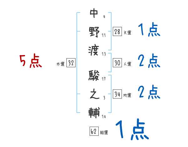 天運![]() | 中野渡駿之輔さんの天運は28画の1つ星!家庭環境に注意。スポーツで活躍できる能力があるかも。 家系が持つ宿命的な運勢を表します。祖先から受け継いだ苗字ですので自分の力が及びません。家柄を象徴します。 |