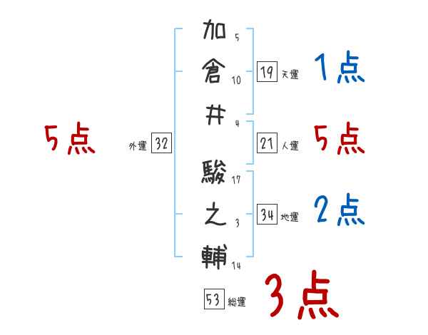 外運![]() | 加倉井駿之輔さんの外運は32画の5つ星!柔軟性があり成功する。チャンスが多く金運が良い。 生活面を象徴する運勢です。外部から受ける影響力を表し、結婚運、家庭運や職場、環境への順応性を表します。 |
