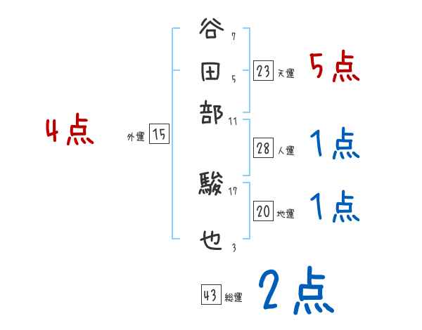 天運![]() | 谷田部駿也さんの天運は23画の5つ星!想像力に優れ活力がある。一代で成功し名誉を手に入れる。 家系が持つ宿命的な運勢を表します。祖先から受け継いだ苗字ですので自分の力が及びません。家柄を象徴します。 |