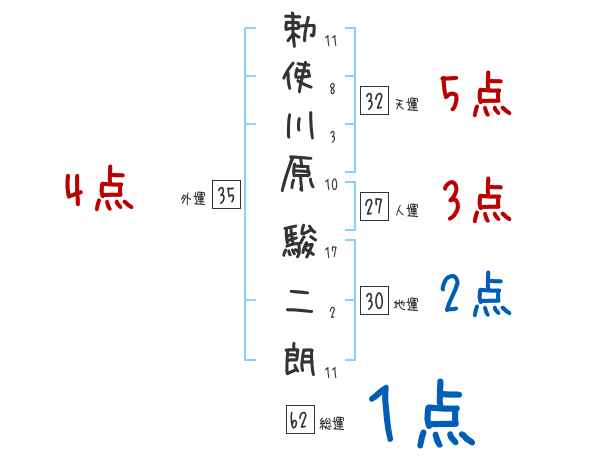 天運![]() | 勅使川原駿二朗さんの天運は32画の5つ星!柔軟性があり成功する。チャンスが多く金運が良い。 家系が持つ宿命的な運勢を表します。祖先から受け継いだ苗字ですので自分の力が及びません。家柄を象徴します。 |