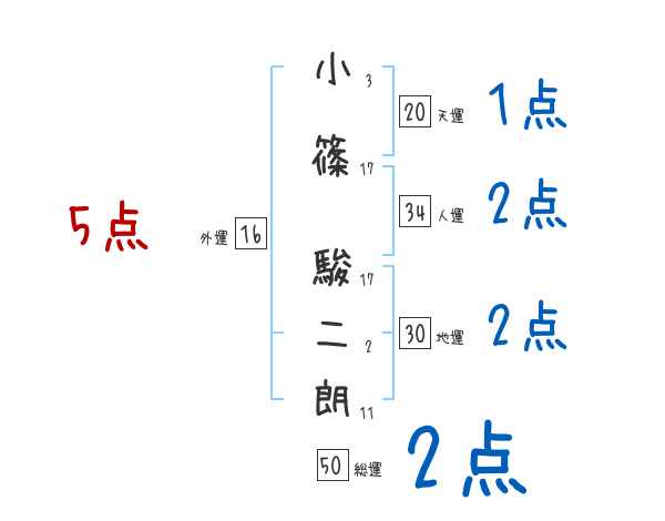 総運![]() | 小篠駿二朗さんの総運は50画の2つ星!浮き沈みが激しく不安定。しりすぼみに衰退しやすいので注意しましょう。 あなたの人生を表す1番重要な運勢です。生涯を通じて影響する総合運となり、主に50歳以降の晩年期に影響を及ぼします。 |