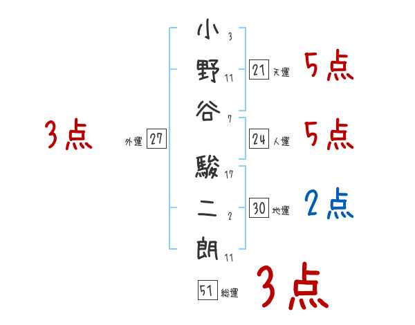 天運![]() | 小野谷駿二朗さんの天運は21画の5つ星!統率力がある。独立し成功する。名誉を手に入れる。 家系が持つ宿命的な運勢を表します。祖先から受け継いだ苗字ですので自分の力が及びません。家柄を象徴します。 |