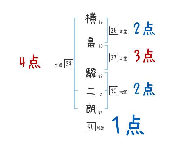 総運![]() | 横畠駿二朗さんの総運は56画の1つ星!消極的で無気力になりがち。誠実な気持ちが必要でしょう。 あなたの人生を表す1番重要な運勢です。生涯を通じて影響する総合運となり、主に50歳以降の晩年期に影響を及ぼします。 |