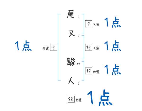 人運![]() | 尾又駿人さんの人運は19画の1つ星!優れた才能を持ちますが、協調性が足りないことも。周りの人と協力する事を意識しましょう。 性格や才能などを表す2番目に重要な運勢です。人間関係や協調性、社会的な成功に影響します。主に20歳から50歳ぐらいまでの中年期の運勢を表します。 |