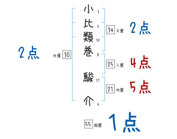外運![]() | 小比類巻駿介さんの外運は30画の2つ星!浮き沈みの激しさに注意しましょう。 生活面を象徴する運勢です。外部から受ける影響力を表し、結婚運、家庭運や職場、環境への順応性を表します。 |