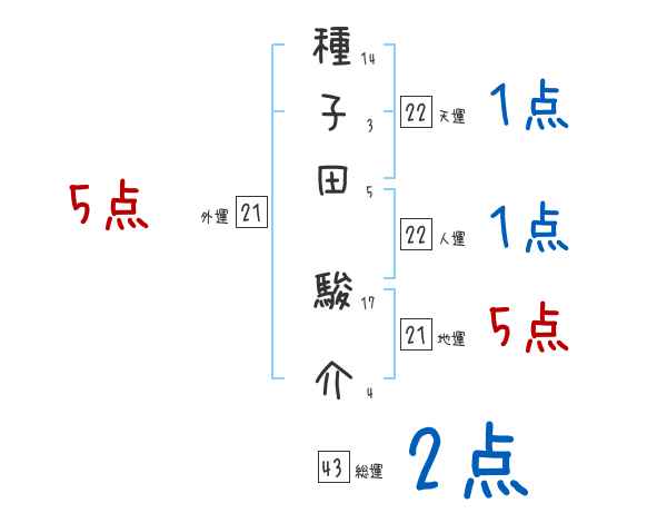 総運![]() | 種子田駿介さんの総運は43画の2つ星!頑固な性格で独立心が強いかも。やや非現実的で浪費に注意しましょう。 あなたの人生を表す1番重要な運勢です。生涯を通じて影響する総合運となり、主に50歳以降の晩年期に影響を及ぼします。 |