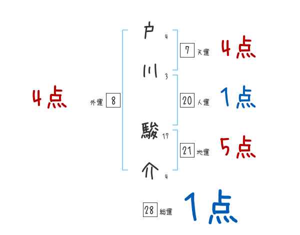 天運![]() | 戸川駿介さんの天運は7画の4つ星!強い意志や信念を持ち独立心が強い。自立する。 家系が持つ宿命的な運勢を表します。祖先から受け継いだ苗字ですので自分の力が及びません。家柄を象徴します。 |