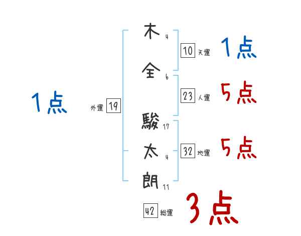天運![]() | 木全駿太朗さんの天運は10画の1つ星!不安を感じやすい傾向。ストレスを抱えないように注意しましょう。 家系が持つ宿命的な運勢を表します。祖先から受け継いだ苗字ですので自分の力が及びません。家柄を象徴します。 |