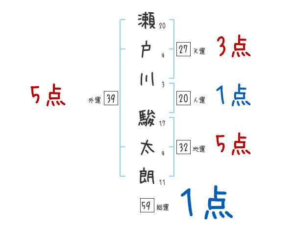 外運![]() | 瀬戸川駿太朗さんの外運は39画の5つ星!社交性に優れ人望が厚い。人の上に立ち成功する。 生活面を象徴する運勢です。外部から受ける影響力を表し、結婚運、家庭運や職場、環境への順応性を表します。 |
