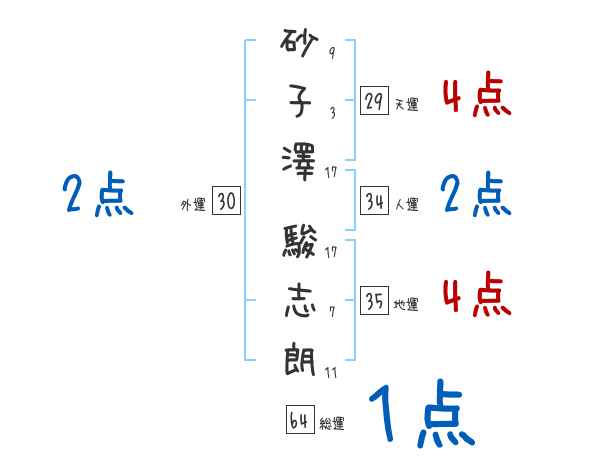 天運![]() | 砂子澤駿志朗さんの天運は29画の4つ星!完全主義で才能がある。厳格な心の持ち主。 家系が持つ宿命的な運勢を表します。祖先から受け継いだ苗字ですので自分の力が及びません。家柄を象徴します。 |