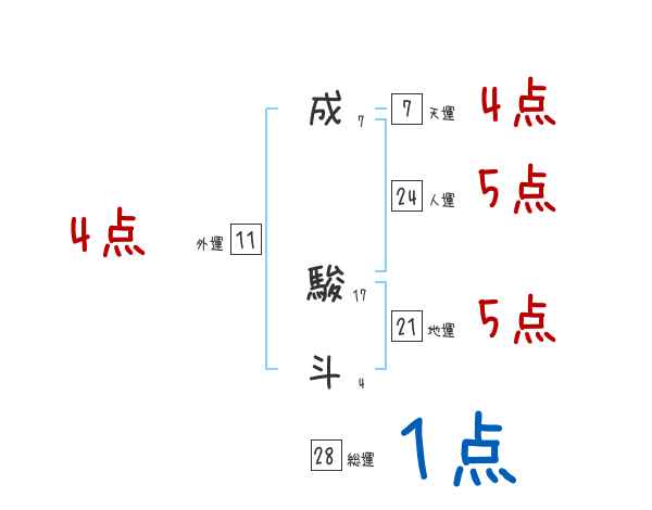 天運![]() | 成駿斗さんの天運は7画の4つ星!強い意志や信念を持ち独立心が強い。自立する。 家系が持つ宿命的な運勢を表します。祖先から受け継いだ苗字ですので自分の力が及びません。家柄を象徴します。 |