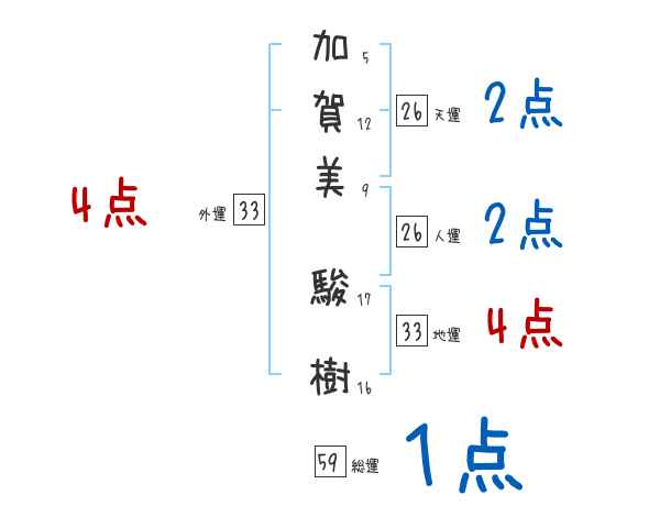 外運![]() | 加賀美駿樹さんの外運は33画の4つ星!権力志向でプライドが高い。勇気があり運を切り開き成功する。 生活面を象徴する運勢です。外部から受ける影響力を表し、結婚運、家庭運や職場、環境への順応性を表します。 |