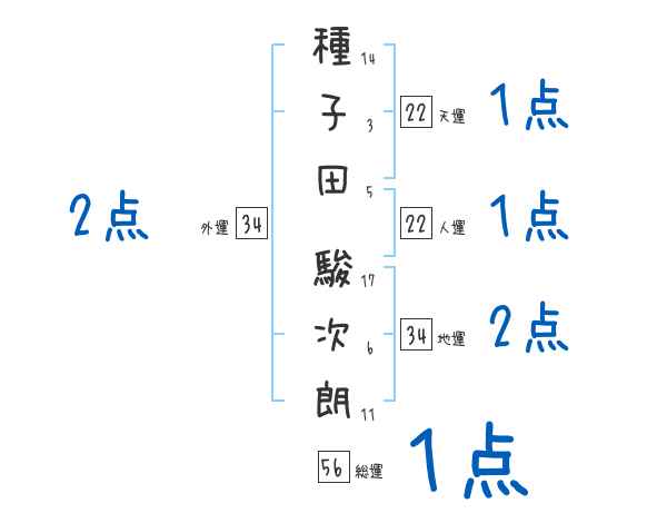 人運![]() | 種子田駿次朗さんの人運は22画の1つ星!努力することが苦手ないっぽう手先が器用。芸術性にも優れる。 性格や才能などを表す2番目に重要な運勢です。人間関係や協調性、社会的な成功に影響します。主に20歳から50歳ぐらいまでの中年期の運勢を表します。 |