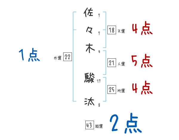 総運![]() | 佐々木駿汰さんの総運は43画の2つ星!頑固な性格で独立心が強いかも。やや非現実的で浪費に注意しましょう。 あなたの人生を表す1番重要な運勢です。生涯を通じて影響する総合運となり、主に50歳以降の晩年期に影響を及ぼします。 |