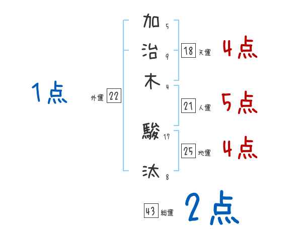天運![]() | 加治木駿汰さんの天運は18画の4つ星!情熱的で剛気。忍耐力があり信頼される。 家系が持つ宿命的な運勢を表します。祖先から受け継いだ苗字ですので自分の力が及びません。家柄を象徴します。 |