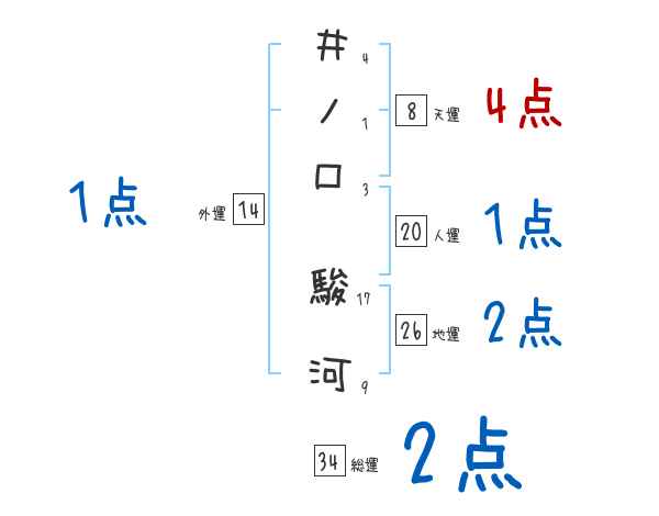 総運![]() | 井ノ口駿河さんの総運は34画の2つ星!独創性に優れるが、自尊心が強く災難に注意しましょう。 あなたの人生を表す1番重要な運勢です。生涯を通じて影響する総合運となり、主に50歳以降の晩年期に影響を及ぼします。 |