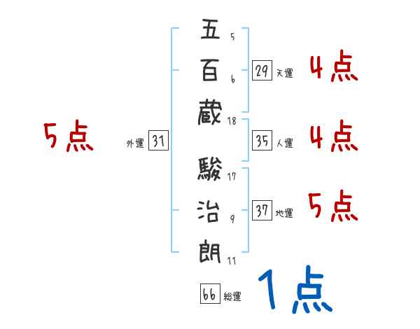 総運![]() | 五百蔵駿治朗さんの総運は66画の1つ星!迷うことが多く挫折しやすい傾向が。辛抱強く物事に取り組みましょう。 あなたの人生を表す1番重要な運勢です。生涯を通じて影響する総合運となり、主に50歳以降の晩年期に影響を及ぼします。 |