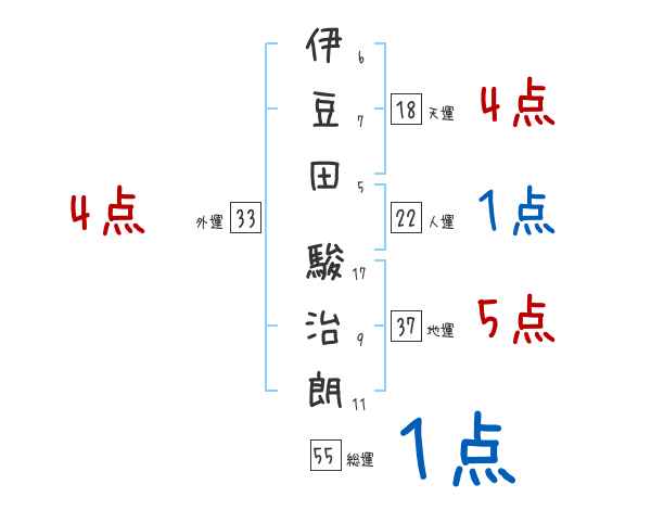 外運![]() | 伊豆田駿治朗さんの外運は33画の4つ星!権力志向でプライドが高い。勇気があり運を切り開き成功する。 生活面を象徴する運勢です。外部から受ける影響力を表し、結婚運、家庭運や職場、環境への順応性を表します。 |