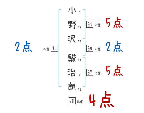 総運![]() | 小野沢駿治朗さんの総運は68画の4つ星!潜在能力が高く集中力が高い。勤勉に励み発展する。 あなたの人生を表す1番重要な運勢です。生涯を通じて影響する総合運となり、主に50歳以降の晩年期に影響を及ぼします。 |