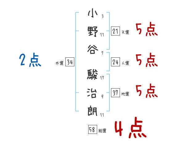 天運![]() | 小野谷駿治朗さんの天運は21画の5つ星!統率力がある。独立し成功する。名誉を手に入れる。 家系が持つ宿命的な運勢を表します。祖先から受け継いだ苗字ですので自分の力が及びません。家柄を象徴します。 |